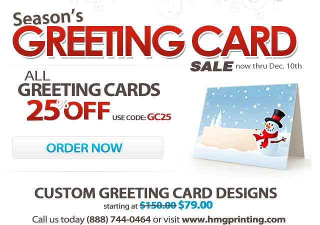 Hello %FIRSTNAME% At HMGPrinting.com, Cyber Monday Begins TODAY, and lasts through December 10th! For the next 11 days only, enjoy 25% Off Greeting Card Printing - use code "GC25". Also, have us design your *Cyber Monday coupon specials are valid through December 10, 2009. Coupon offers are valid only on orders