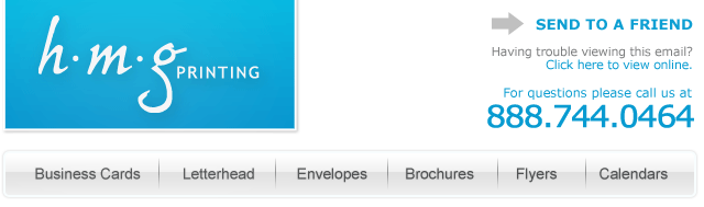 ![]() VIsit us online at hmgprinting.com or call us at 888.744.0464 2834 La Mirada Dr. - Suite E | Vista, CA 92081 Privacy Policy | Customer Service | Unsubscribe |